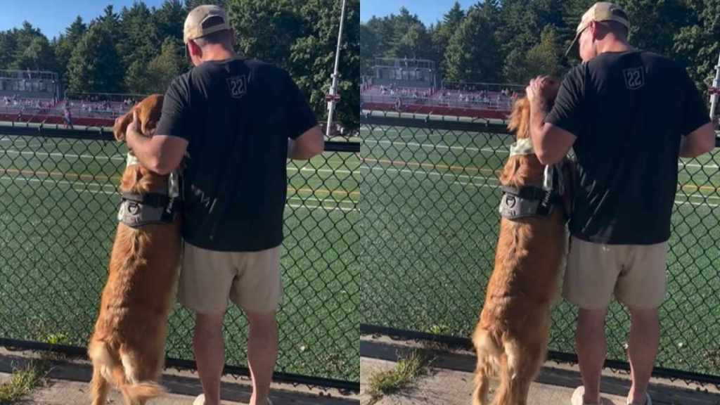 In the video, the Golden Retriever’s wagging tail while he watches people playing soccer is quite telling. It swings back and forth in non-stop celebration as his owner keeps one hand on him, giving steady face and head rubs the entire time — all while Finley focuses on the field, as if he could not miss any second of it.