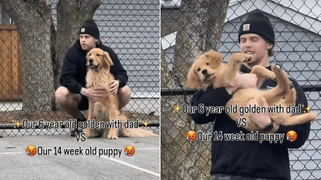 Many people imagine puppies as tiny, cuddly companions who happily stay in their arms. Reality, however, usually involves wiggling bodies, sudden bursts of energy, and a strong desire to do the exact opposite of what you expect. It’s safe to say that raising a puppy can be equal parts joy and exhaustion. A video on Instagram shows this difference clearly through the reactions of a Golden Retriever puppy and an adult dog with their dad.