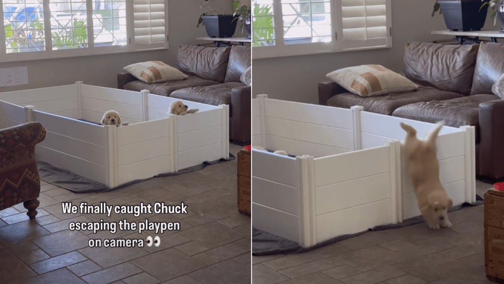 An adorable Instagram video from user @maizey_daze shows a Golden Retriever puppy who, if there is one hobby he has, is jailbreaking. Chuck, the puppy, tests the limits of his playpen, trying to escape it, with a couple of puppy siblings watching from inside, like they have seen this film before. The on-screen text says, “We finally caught Chuck escaping the playpen on camera.” And once you see it, you cannot really argue with the evidence.