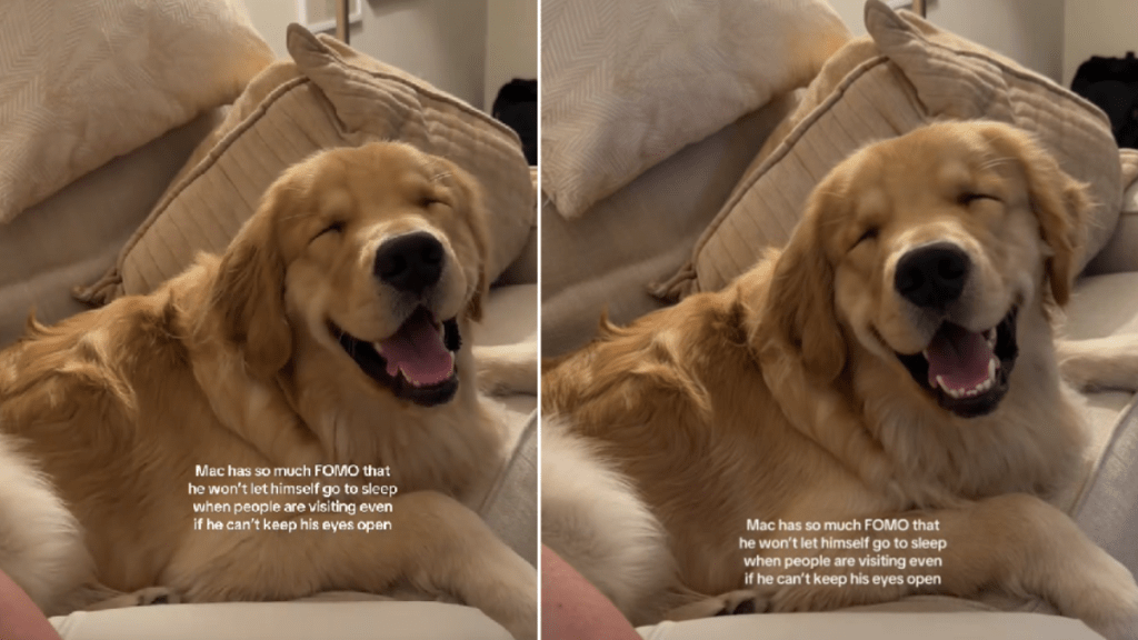 The short video focuses on Mac resting on a couch inside a cozy living room. Beige cushions sit behind him, while the sleepy pup leans against someone nearby. His eyes stay nearly shut, but his mouth hangs open in a big, content smile. The Golden Retriever looks exhausted, yet he still seems determined to stay part of the action.