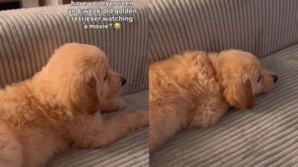 A little Golden Retriever puppy named Sunset is winning hearts, and all it took him was to sit still for a movie like the most polite little viewer in the house. In an adorable Instagram video from @thegoldensunset_, the 8-week-old pup lies on a couch and stares up at the TV while an animated film plays, with the on-screen caption asking, “Have you ever seen an 8-week-old golden retriever watching a movie?” Meanwhile, the video’s caption aptly says, “Melting.”